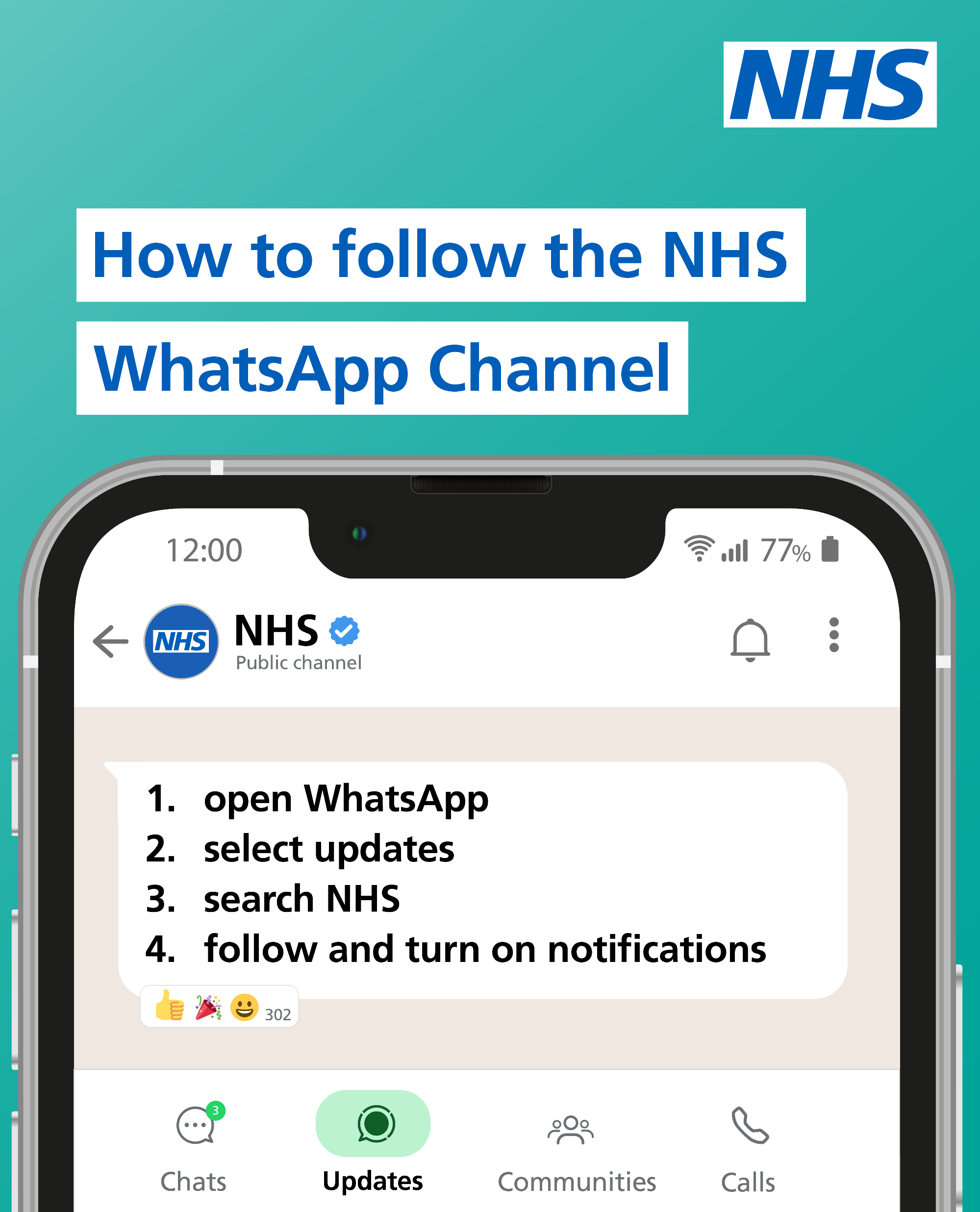 Go to WhatsApp and search for ‘NHS’ under the ‘updates’ tab and sign up!